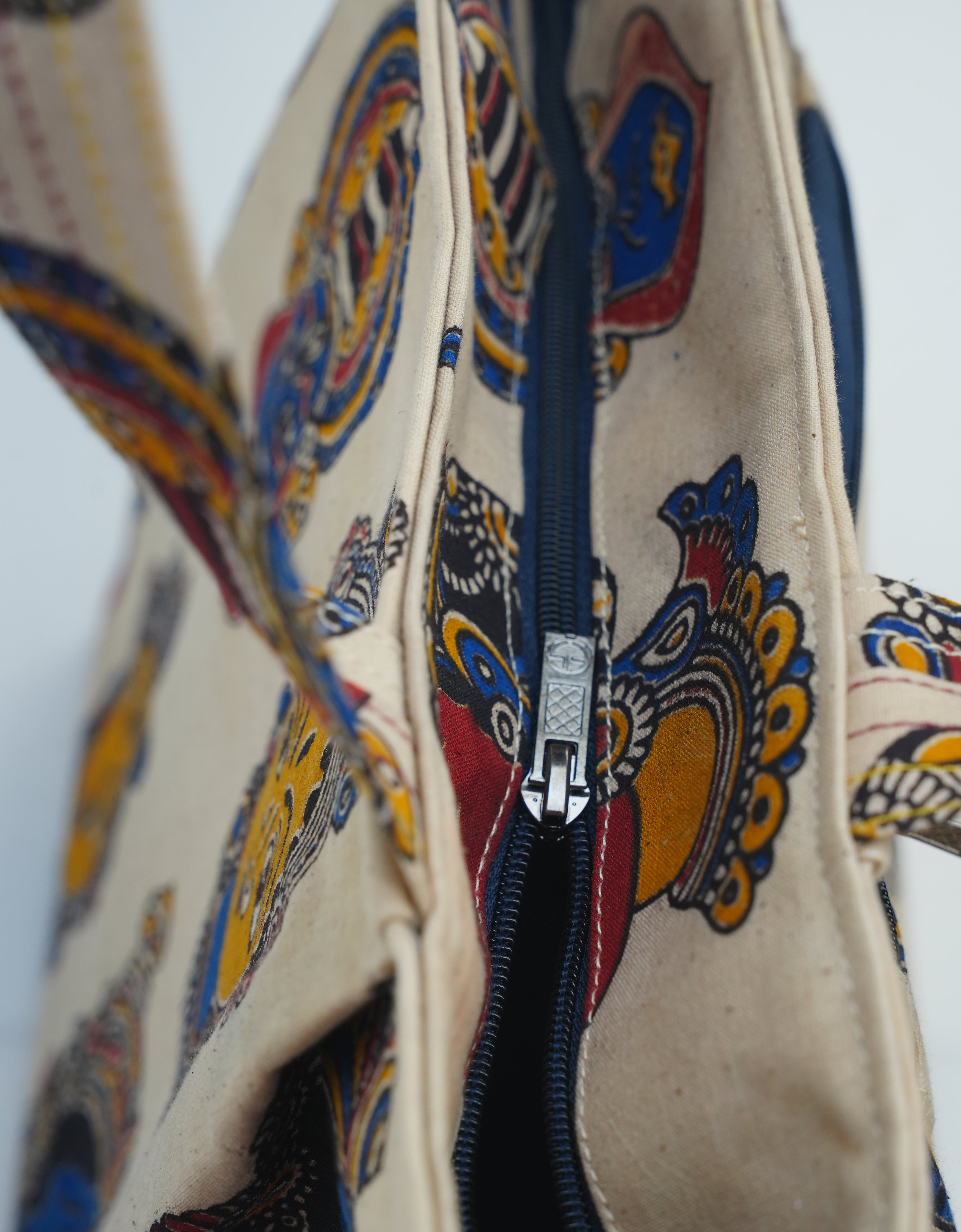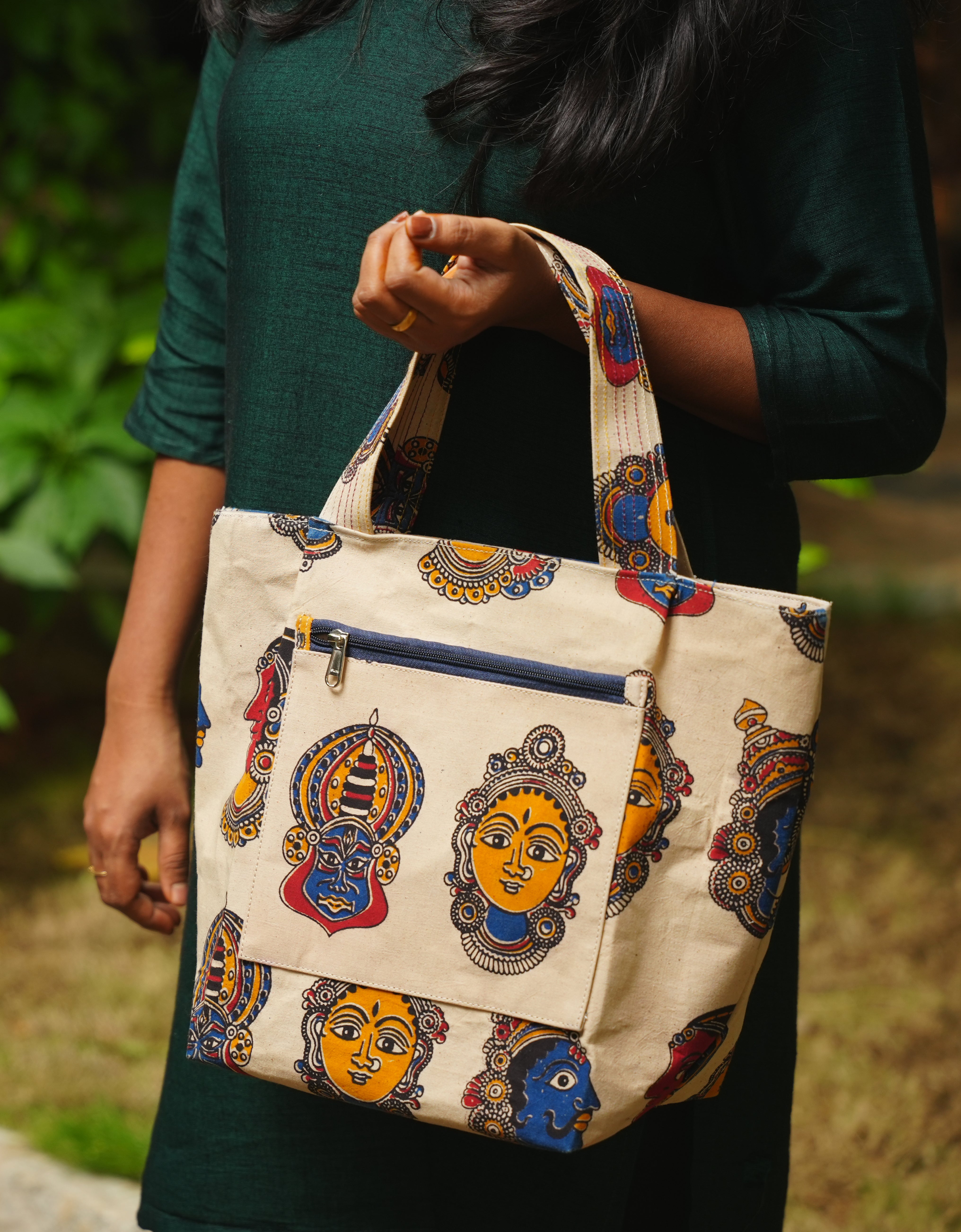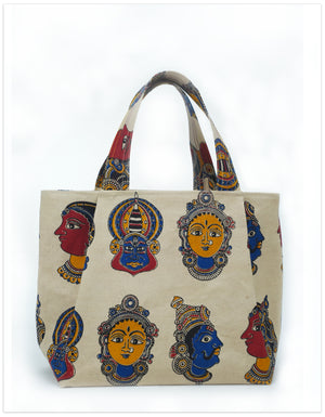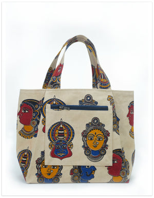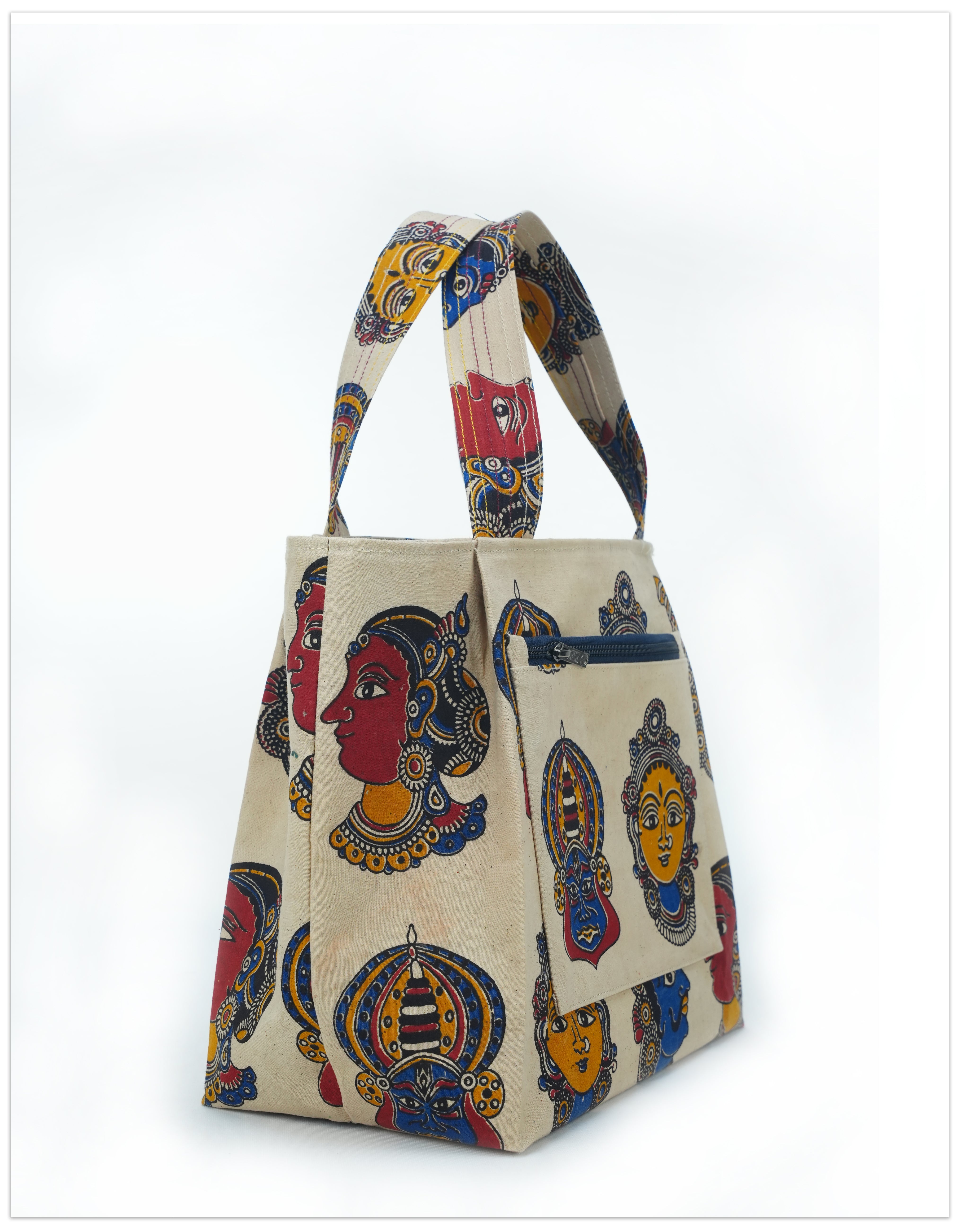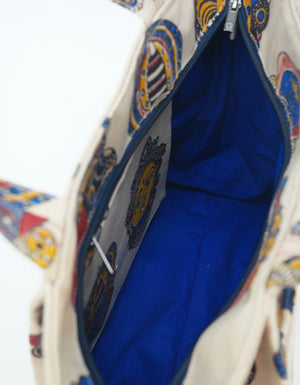A bold expression of Indian heritage, this canvas tote features striking Kalamkari block prints—an age-old art form known for its detailed hand-carved motifs and vibrant natural dyes.